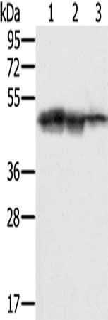 Gel: 8%SDS-PAGE, Lysate: 40 μg, Lane 1-3: Hepg2 cells, K562 cells, Jurkat cells, Primary antibody: CSB-PA062373(SMARCB1 Antibody) at dilution 1/400, Secondary antibody: Goat anti rabbit IgG at 1/8000 dilution, Exposure time: 10 seconds