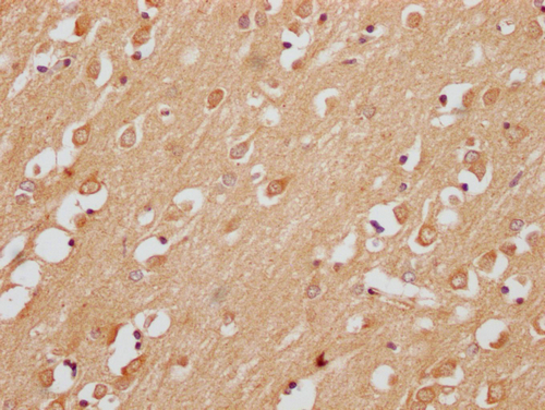 IHC image of CSB-PA774793LA01HU diluted at 1:200 and staining in paraffin-embedded human brain tissue performed on a Leica BondTM system. After dewaxing and hydration, antigen retrieval was mediated by high pressure in a citrate buffer (pH 6.0). Section was blocked with 10% normal goat serum 30min at RT. Then primary antibody (1% BSA) was incubated at 4°C overnight. The primary is detected by a Goat anti-rabbit polymer IgG labeled by HRP and visualized using 0.05% DAB.