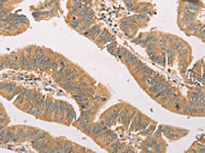 The image on the left is immunohistochemistry of paraffin-embedded Human colon cancer tissue using CSB-PA273741(SNAP91 Antibody) at dilution 1/20, on the right is treated with fusion protein. (Original magnification: ×200)
