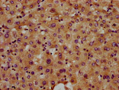 IHC image of CSB-PA840582LA01HU diluted at 1:400 and staining in paraffin-embedded human liver tissue performed on a Leica BondTM system. After dewaxing and hydration, antigen retrieval was mediated by high pressure in a citrate buffer (pH 6.0). Section was blocked with 10% normal goat serum 30min at RT. Then primary antibody (1% BSA) was incubated at 4°C overnight. The primary is detected by a biotinylated secondary antibody and visualized using an HRP conjugated SP system.