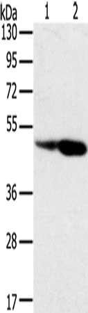 Gel: 8%SDS-PAGE, Lysate: 40 μg, Lane 1-2: Hepg2 cells, hela cells, Primary antibody: CSB-PA712032(SNX8 Antibody) at dilution 1/400, Secondary antibody: Goat anti rabbit IgG at 1/8000 dilution, Exposure time: 1 minute