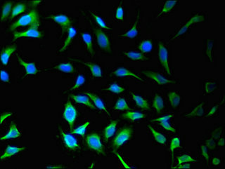 Immunofluorescent analysis of Hela cells using CSB-PA896917LA01HU at dilution of 1:100 and Alexa Fluor 488-congugated AffiniPure Goat Anti-Rabbit IgG(H+L)