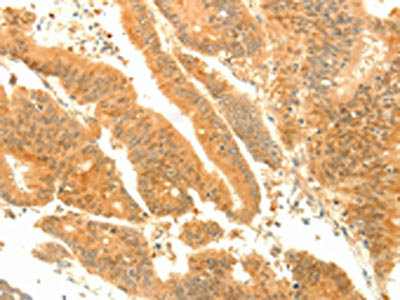 The image on the left is immunohistochemistry of paraffin-embedded Human colon cancer tissue using CSB-PA795855(SOCS6 Antibody) at dilution 1/35, on the right is treated with fusion protein. (Original magnification: ×200)