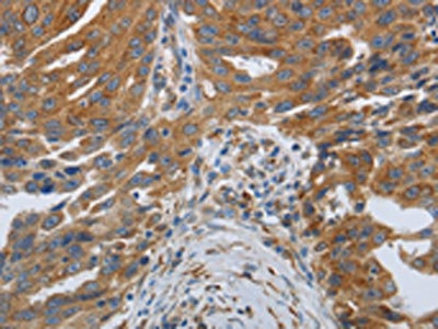 The image on the left is immunohistochemistry of paraffin-embedded Human ovarian cancer tissue using CSB-PA090256(SPAG1 Antibody) at dilution 1/25, on the right is treated with synthetic peptide. (Original magnification: ×200)