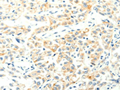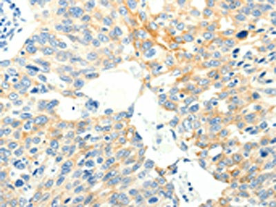 The image on the left is immunohistochemistry of paraffin-embedded Human lung cancer tissue using CSB-PA440250(SPAG5 Antibody) at dilution 1/35, on the right is treated with fusion protein. (Original magnification: ×200)