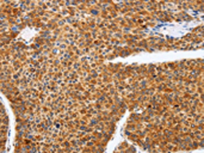 The image on the left is immunohistochemistry of paraffin-embedded Human gastric cancer tissue using CSB-PA583273(SPATA13 Antibody) at dilution 1/25, on the right is treated with fusion protein. (Original magnification: ×200)