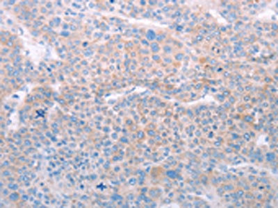 The image on the left is immunohistochemistry of paraffin-embedded Human lung cancer tissue using CSB-PA161929(SPATA6 Antibody) at dilution 1/50, on the right is treated with fusion protein. (Original magnification: ×200)