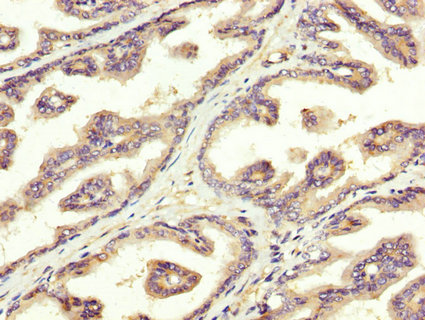 IHC image of CSB-PA022657LA01HU diluted at 1:300 and staining in paraffin-embedded human prostate tissue performed on a Leica BondTM system. After dewaxing and hydration, antigen retrieval was mediated by high pressure in a citrate buffer (pH 6.0). Section was blocked with 10% normal goat serum 30min at RT. Then primary antibody (1% BSA) was incubated at 4°C overnight. The primary is detected by a biotinylated secondary antibody and visualized using an HRP conjugated SP system.