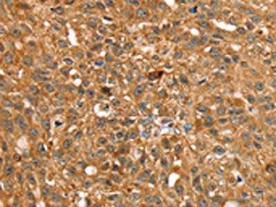 The image on the left is immunohistochemistry of paraffin-embedded Human liver cancer tissue using CSB-PA777365(STARD5 Antibody) at dilution 1/25, on the right is treated with synthetic peptide. (Original magnification: ×200)