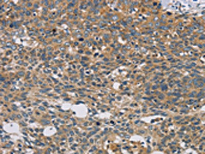 The image on the left is immunohistochemistry of paraffin-embedded Human cervical cancer tissue using CSB-PA130463(STAT4 Antibody) at dilution 1/30, on the right is treated with fusion protein. (Original magnification: ×200)