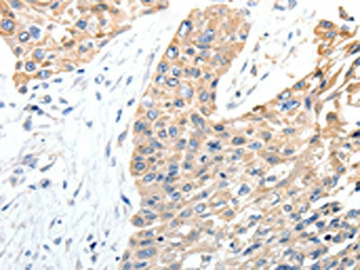 The image on the left is immunohistochemistry of paraffin-embedded Human esophagus cancer tissue using CSB-PA795802(STEAP4 Antibody) at dilution 1/40, on the right is treated with synthetic peptide. (Original magnification: ×200)