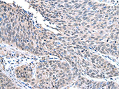The image on the left is immunohistochemistry of paraffin-embedded Human thyroid cancer tissue using CSB-PA958257(STRAP Antibody) at dilution 1/25, on the right is treated with fusion protein. (Original magnification: ×200)