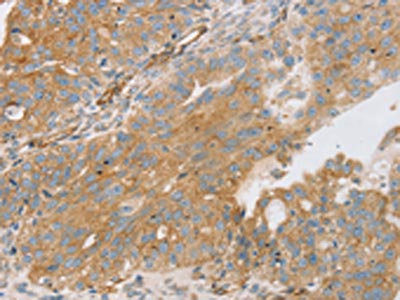 The image on the left is immunohistochemistry of paraffin-embedded Human ovarian cancer tissue using CSB-PA560536(STX16 Antibody) at dilution 1/30, on the right is treated with fusion protein. (Original magnification: ×200)