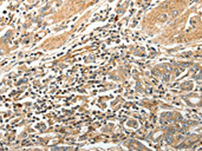 The image on the left is immunohistochemistry of paraffin-embedded Human gastric cancer tissue using CSB-PA269128(STX1A Antibody) at dilution 1/20, on the right is treated with synthetic peptide. (Original magnification: ×200)