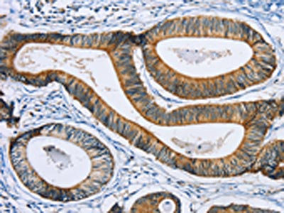 The image on the left is immunohistochemistry of paraffin-embedded Human colon cancer tissue using CSB-PA209693(SULT1B1 Antibody) at dilution 1/30, on the right is treated with fusion protein. (Original magnification: ×200)