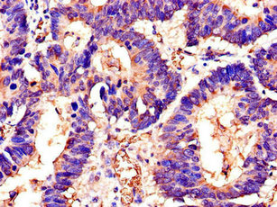 Immunohistochemistry of paraffin-embedded human colon cancer using CSB-PA636328LA01HU at dilution of 1:100