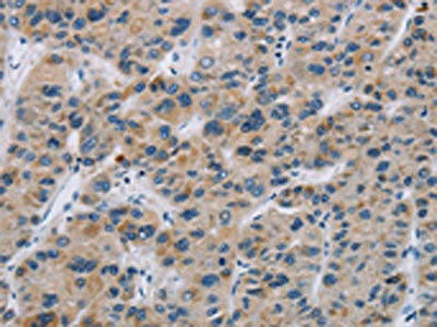 The image on the left is immunohistochemistry of paraffin-embedded Human liver cancer tissue using CSB-PA557600(SYN2 Antibody) at dilution 1/40, on the right is treated with synthetic peptide. (Original magnification: ×200)