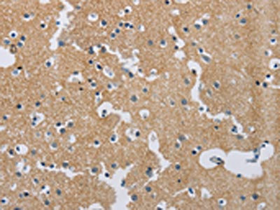 The image on the left is immunohistochemistry of paraffin-embedded Human brain tissue using CSB-PA553180(SYN2 Antibody) at dilution 1/40, on the right is treated with synthetic peptide. (Original magnification: ×200)