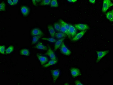 Immunofluorescence staining of HepG2 cells with CSB-PA857006LA01HU at 1:100, counter-stained with DAPI. The cells were fixed in 4% formaldehyde, permeabilized using 0.2% Triton X-100 and blocked in 10% normal Goat Serum. The cells were then incubated with the antibody overnight at 4°C. The secondary antibody was Alexa Fluor 488-congugated AffiniPure Goat Anti-Rabbit IgG(H+L).