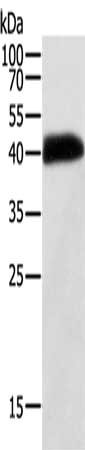 Gel: 10%SDS-PAGE, Lysate: 40 μg, Lane: Human thigh malignant fibrous histiocytoma tissue, Primary antibody: CSB-PA447958(SYT5 Antibody) at dilution 1/150, Secondary antibody: Goat anti rabbit IgG at 1/8000 dilution, Exposure time: 8 hours