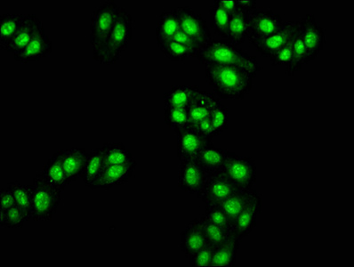 Immunofluorescence staining of HepG2 cells with CSB-PA023110LA01HU at 1:100, counter-stained with DAPI. The cells were fixed in 4% formaldehyde, permeabilized using 0.2% Triton X-100 and blocked in 10% normal Goat Serum. The cells were then incubated with the antibody overnight at 4°C. The secondary antibody was Alexa Fluor 488-congugated AffiniPure Goat Anti-Rabbit IgG(H+L).