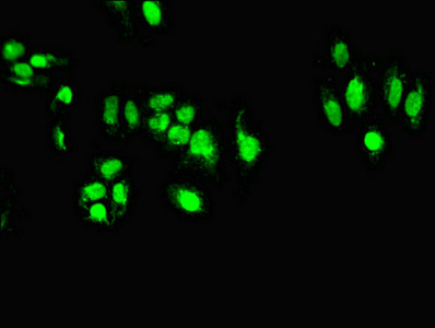 Immunofluorescent analysis of HepG2 cells using CSB-PA023129EA01HU at dilution of 1:100 and Alexa Fluor 488-congugated AffiniPure Goat Anti-Rabbit IgG(H+L)