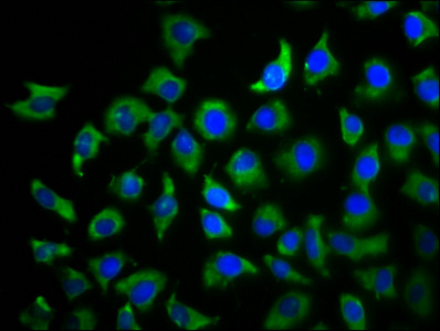 Immunofluorescence staining of A549 cells with CSB-PA883599LA01HU at 1:100, counter-stained with DAPI. The cells were fixed in 4% formaldehyde, permeabilized using 0.2% Triton X-100 and blocked in 10% normal Goat Serum. The cells were then incubated with the antibody overnight at 4°C. The secondary antibody was Alexa Fluor 488-congugated AffiniPure Goat Anti-Rabbit IgG(H+L).