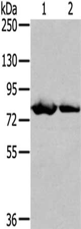 Gel: 6%SDS-PAGE,Lysate: 40 μg,Lane 1-2: Mouse heart tissue, MCF7 cells,Primary antibody: CSB-PA965532(TGM5 Antibody) at dilution 1/400 dilution,Secondary antibody: Goat anti rabbit IgG at 1/8000 dilution,Exposure time: 2 minutes