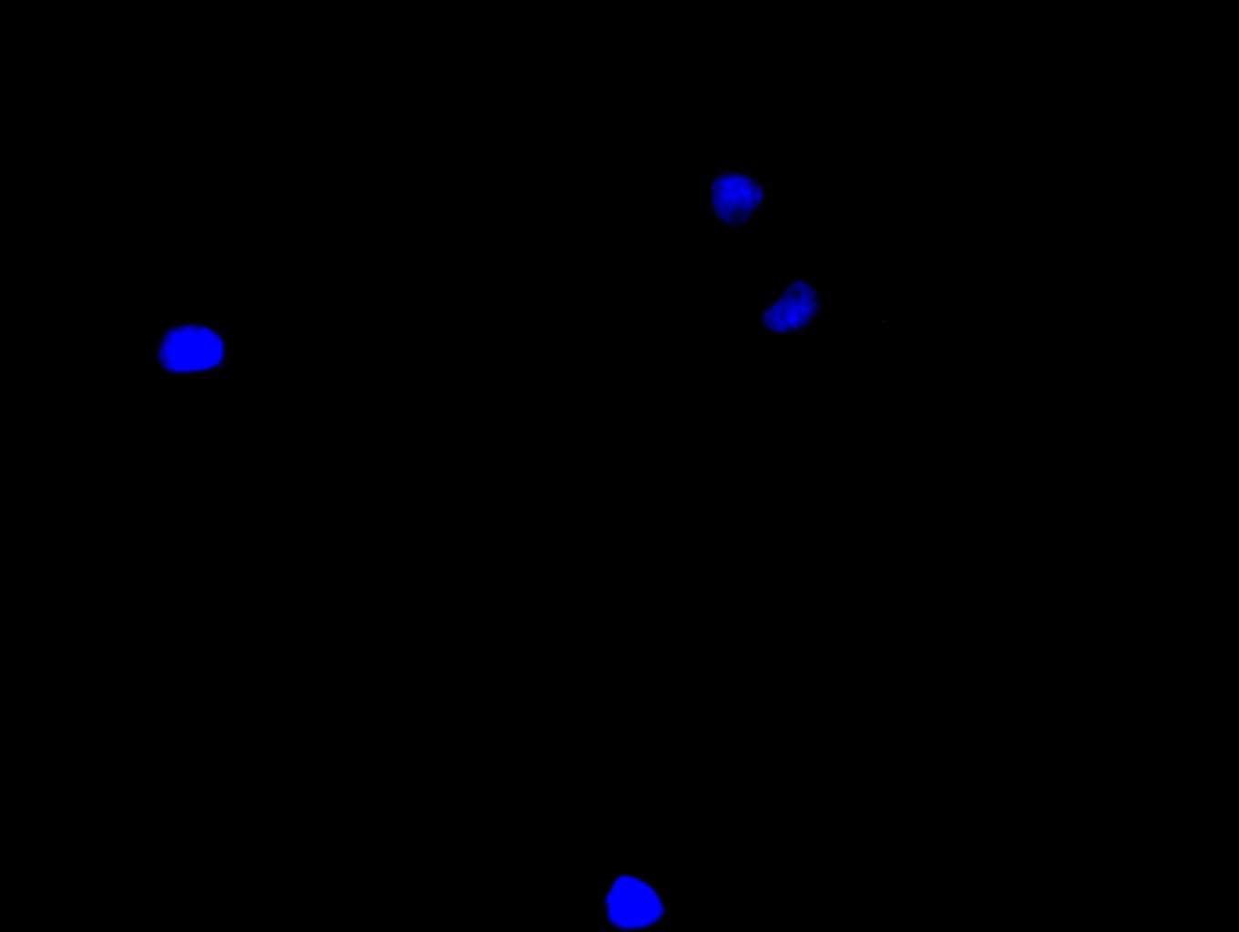 Immunofluorescence staining of A549 cell with 5% goat serum, counter-stained with DAPI. The cells were fixed in 4% formaldehyde and blocked in 10% normal Goat Serum. The cells were then incubated with the antibody overnight at 4C. The secondary antibody was Alexa Fluor 488-congugated AffiniPure Goat Anti-Rabbit IgG(H+L).
