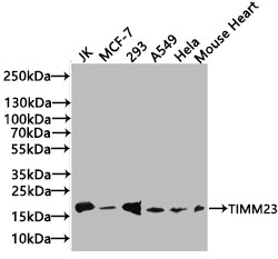 This TIMM23 polyclonal antibody has been validated to recognize the TIMM23 protein in ELISA, WB, and IF assays. TIMM23 is an essential protein found in the mitochondrial inner membrane, which is involved in the translocation of preproteins into mitochondria. Therefore, this TIMM23 polyclonal antibody may be utilized to investigate the function and localization of the TIMM23 protein and its role in mitochondrial protein import.