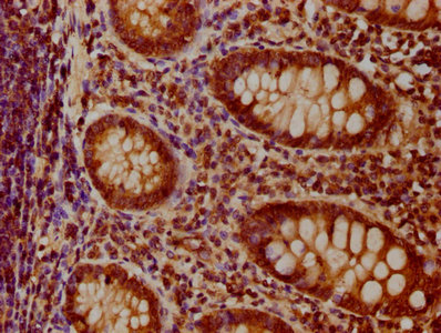 IHC image of CSB-PA885685LA01HU diluted at 1:100 and staining in paraffin-embedded human appendix tissue performed on a Leica BondTM system. After dewaxing and hydration, antigen retrieval was mediated by high pressure in a citrate buffer (pH 6.0). Section was blocked with 10% normal goat serum 30min at RT. Then primary antibody (1% BSA) was incubated at 4°C overnight. The primary is detected by a biotinylated secondary antibody and visualized using an HRP conjugated SP system.