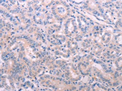 The image on the left is immunohistochemistry of paraffin-embedded Human thyroid cancer tissue using CSB-PA188746(TIMP4 Antibody) at dilution 1/15, on the right is treated with fusion protein. (Original magnification: ×200)
