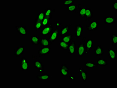Immunofluorescence staining of Hela cells with CSB-PA523988LA01HU at 1:100, counter-stained with DAPI. The cells were fixed in 4% formaldehyde, permeabilized using 0.2% Triton X-100 and blocked in 10% normal Goat Serum. The cells were then incubated with the antibody overnight at 4°C. The secondary antibody was Alexa Fluor 488-congugated AffiniPure Goat Anti-Rabbit IgG(H+L).