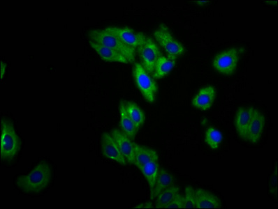 Immunofluorescence staining of HepG2 cells with CSB-PA774796LA01HU at 1:133, counter-stained with DAPI. The cells were fixed in 4% formaldehyde, permeabilized using 0.2% Triton X-100 and blocked in 10% normal Goat Serum. The cells were then incubated with the antibody overnight at 4°C. The secondary antibody was Alexa Fluor 488-congugated AffiniPure Goat Anti-Rabbit IgG(H+L).