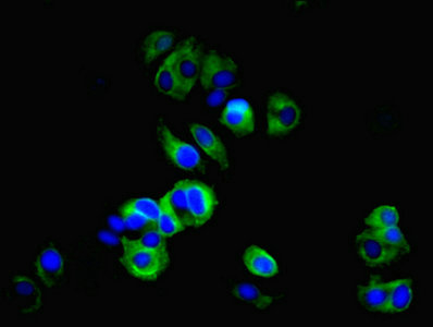 Immunofluorescent analysis of MCF-7 cells using CSB-PA881018EA01HU at dilution of 1:100 and Alexa Fluor 488-congugated AffiniPure Goat Anti-Rabbit IgG(H+L)