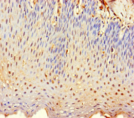 Immunohistochemistry of paraffin-embedded human skin tissue using CSB-PA023836LA01HU at dilution of 1:100