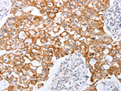 The image on the left is immunohistochemistry of paraffin-embedded Human breast cancer tissue using CSB-PA454097(TNFAIP1 Antibody) at dilution 1/25, on the right is treated with fusion protein. (Original magnification: ×200)