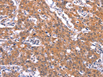 The image on the left is immunohistochemistry of paraffin-embedded Human gastic cancer tissue using CSB-PA057490(TNFRSF17 Antibody) at dilution 1/30, on the right is treated with synthetic peptide. (Original magnification: ×200)