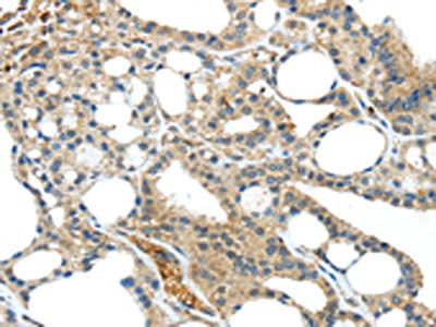 The image on the left is immunohistochemistry of paraffin-embedded Human thyroid cancer tissue using CSB-PA969029(TNIP1 Antibody) at dilution 1/40, on the right is treated with synthetic peptide. (Original magnification: ×200)