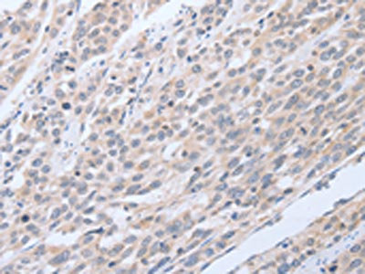 The image on the left is immunohistochemistry of paraffin-embedded Human gastric cancer tissue using CSB-PA261024(TNK2 Antibody) at dilution 1/20, on the right is treated with fusion protein. (Original magnification: ×200)