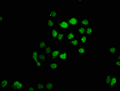 Immunofluorescence staining of Hela cells with CSB-PA024019LA01HU at 1:66, counter-stained with DAPI. The cells were fixed in 4% formaldehyde, permeabilized using 0.2% Triton X-100 and blocked in 10% normal Goat Serum. The cells were then incubated with the antibody overnight at 4°C. The secondary antibody was Alexa Fluor 488-congugated AffiniPure Goat Anti-Rabbit IgG(H+L).