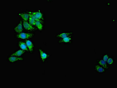 Immunofluorescent analysis of HepG2 cells using CSB-PA618983ESR2HU at dilution of 1:100 and Alexa Fluor 488-congugated AffiniPure Goat Anti-Rabbit IgG(H+L)