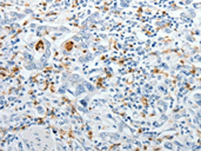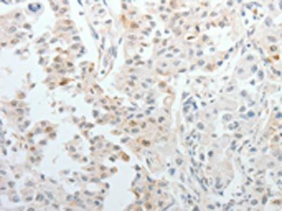 The image on the left is immunohistochemistry of paraffin-embedded Human lung cancer tissue using CSB-PA294602(TOP1MT Antibody) at dilution 1/10, on the right is treated with synthetic peptide. (Original magnification: ×200)