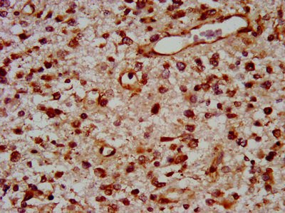 IHC image of CSB-PA024073LA01HU diluted at 1:400 and staining in paraffin-embedded human glioma performed on a Leica BondTM system. After dewaxing and hydration, antigen retrieval was mediated by high pressure in a citrate buffer (pH 6.0). Section was blocked with 10% normal goat serum 30min at RT. Then primary antibody (1% BSA) was incubated at 4°C overnight. The primary is detected by a biotinylated secondary antibody and visualized using an HRP conjugated SP system.