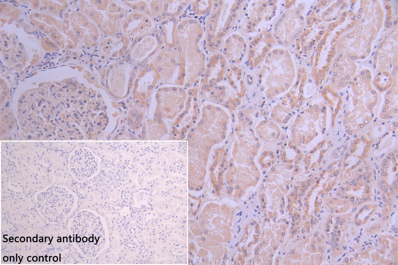 IHC image of CSB-PA024103ESR2HU diluted at 1:100 and staining in paraffin-embedded human Kidney tissue performed on a Leica BondTM system. After dewaxing and hydration, antigen retrieval was mediated by high pressure in a citrate buffer (pH 6.0). Section was blocked with 10% normal goat serum 30min at RT. Then primary antibody (1% BSA) was incubated at 4°C overnight. The primary is detected by a Goat anti-rabbit polymer IgG labeled by HRP and visualized using 0.05% DAB. Secondary antibody only control: uses 1% BSA instead of primary antibody