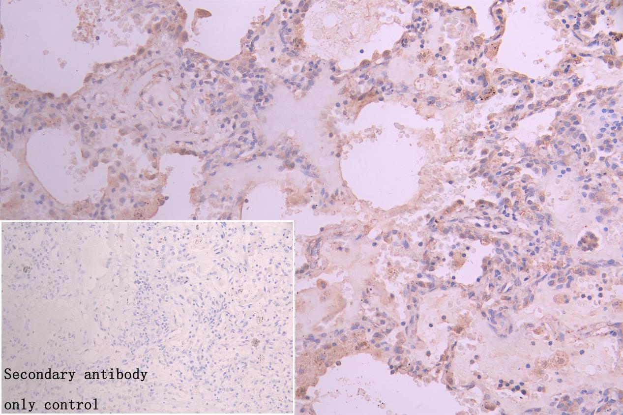 IHC image of CSB-PA024132LA01HU diluted at 1:50 and staining in paraffin-embedded human lung cancer performed on a Leica BondTM system. After dewaxing and hydration, antigen retrieval was mediated by high pressure in a citrate buffer (pH 6.0). Section was blocked with 10% normal goat serum 30min at RT. Then primary antibody (1% BSA) was incubated at 4°C overnight. The primary is detected by a Goat anti-rabbit polymer IgG labeled by HRP and visualized using 0.05% DAB. Secondary antibody only control: uses 1% BSA instead of primary antibody