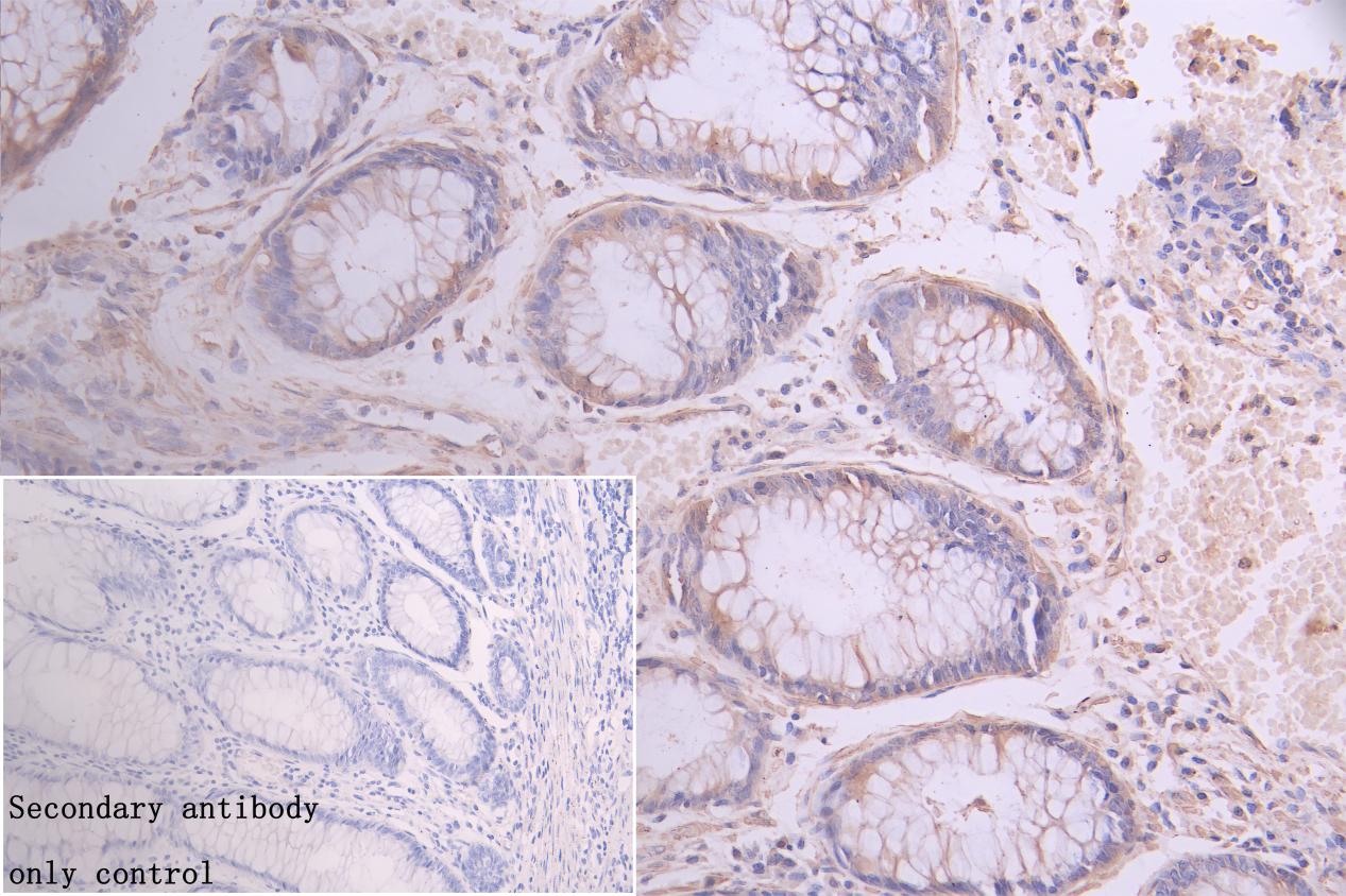 IHC image of CSB-PA024132LA01HU diluted at 1:50 and staining in paraffin-embedded human colorectal cancer performed on a Leica BondTM system. After dewaxing and hydration, antigen retrieval was mediated by high pressure in a citrate buffer (pH 6.0). Section was blocked with 10% normal goat serum 30min at RT. Then primary antibody (1% BSA) was incubated at 4°C overnight. The primary is detected by a Goat anti-rabbit polymer IgG labeled by HRP and visualized using 0.05% DAB. Secondary antibody only control: uses 1% BSA instead of primary antibody