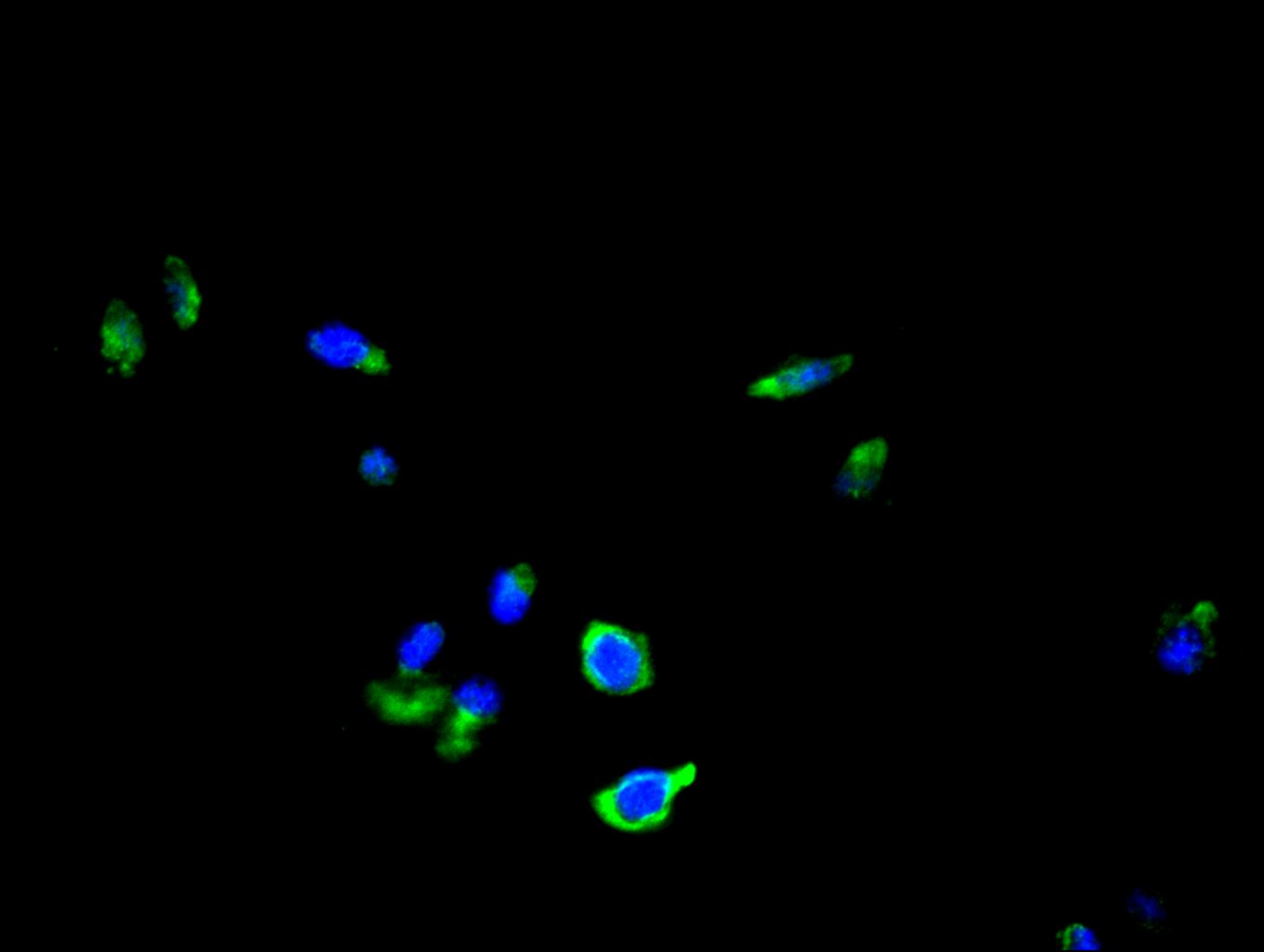 Immunofluorescence staining of A549 cell with CSB-PA025152LA01HU at 1:30, counter-stained with DAPI. The cells were fixed in 4% formaldehyde and blocked in 10% normal Goat Serum. The cells were then incubated with the antibody overnight at 4C. The secondary antibody was Alexa Fluor 488-congugated AffiniPure Goat Anti-Rabbit IgG(H+L).