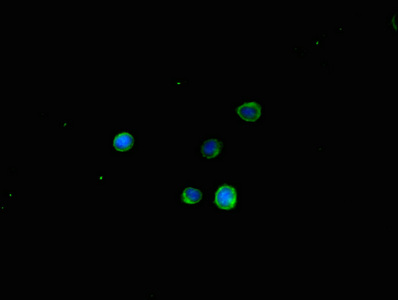 Immunofluorescent analysis of HepG2 cells using CSB-PA842746LA01HU at dilution of 1:100 and Alexa Fluor 488-congugated AffiniPure Goat Anti-Rabbit IgG(H+L)