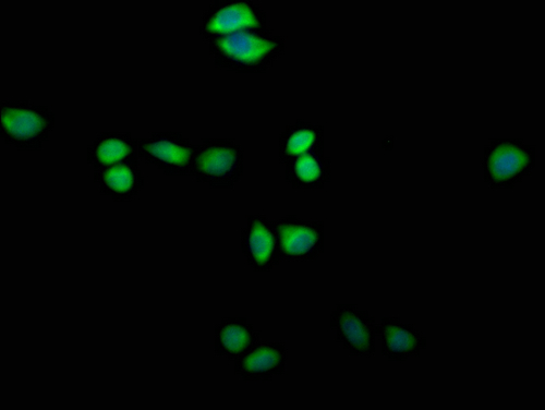 Immunofluorescence staining of Hela cells with CSB-PA839379LA01HU at 1:200, counter-stained with DAPI. The cells were fixed in 4% formaldehyde and blocked in 10% normal Goat Serum. The cells were then incubated with the antibody overnight at 4°C. The secondary antibody was Alexa Fluor 488-congugated AffiniPure Goat Anti-Rabbit IgG(H+L).